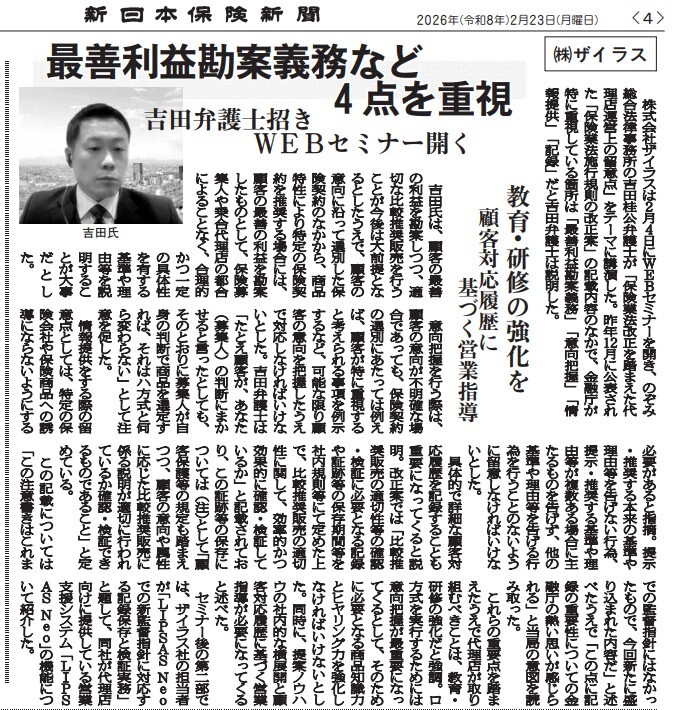 2026年2月23日号の新日本保険新聞に、2月4日に開催した吉田弁護士のWebセミナーに関する記事が掲載されました。是非、ご一読ください。